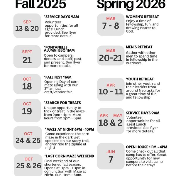 Camp Fontanelle has events throughout the year. The calendar share our special dates with you. If any of these events/activities look good for you, please reach out to Camp Fontanelle staff at fontanelle@greatplainsumc.org.